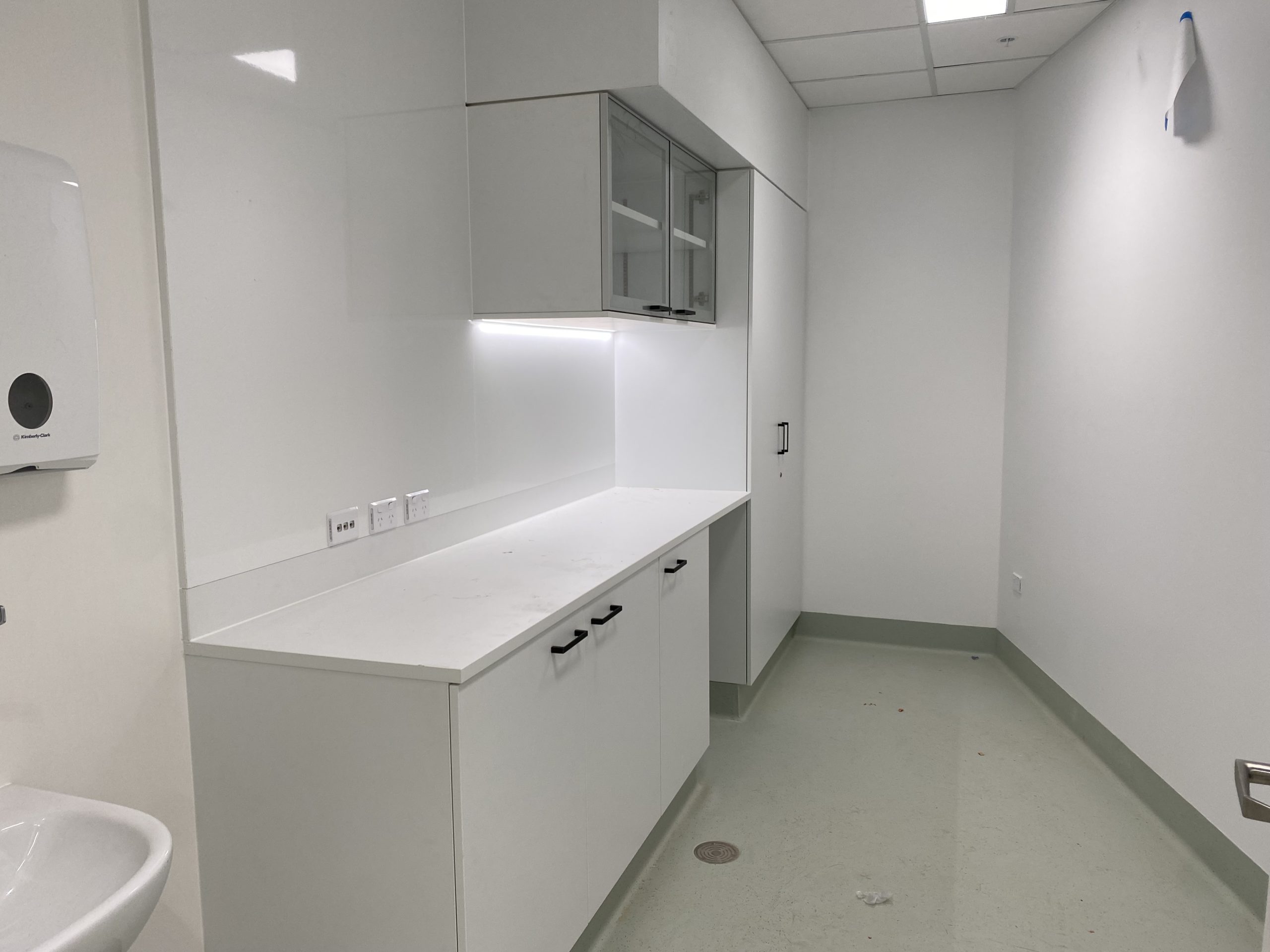Front reception area, past patient waiting area and change rooms and down the treatment suite corridor